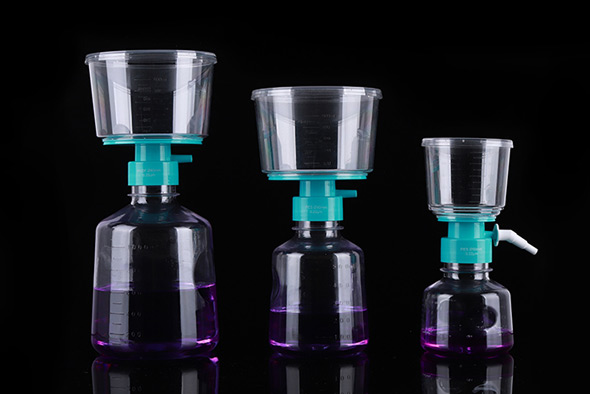 The disposable vacuum filter uses a vacuum pump to provide a pressure difference