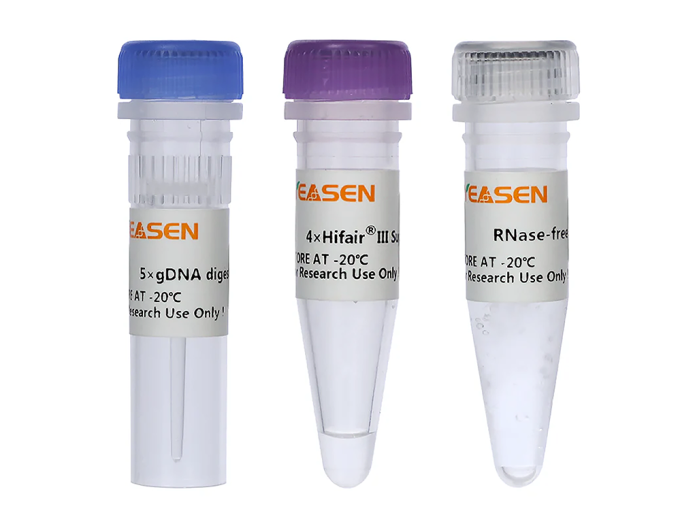 The premix contains 5×gDNA Digester Mix and 4×Hifair™ Ⅲ SuperMix Plus. 5×gDNA Digester Mix can remove residual genomic DNA contamination in RNA templates to ensure more reliable follow-up results. 4×Hifair™ Ⅲ SuperMix Plus contains all components required for Reverse Transcriptase (Buffer, dNTP, Hifair™ Ⅲ Reverse Transcriptase, RNase inhibitor, Random Primers/Oligo (dT)18 Primer Mix), RNA template and Rnase-free H2O are added to reverse transcription, and gDNA digester is terminated simultaneously to ensure the integrity of cDNA.